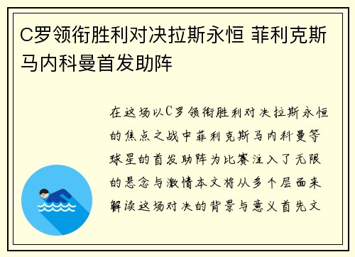 佩德罗·内托近日在一次采访中表示,能与穆里尼奥对抗是一种荣耀,这不仅是对传奇教练的尊重,更是葡萄牙球员在精神层面的传承和自豪。穆里尼奥作为葡萄牙最具影响力的足球人物之一,他的名字早已超越国界,成为世界足球的象征。内托的话语既彰显了年轻一代球员对前辈的敬意,也折射出葡萄牙足球文化的凝聚力和荣耀感。本文将从四个方面展开阐述:其一,穆里尼奥的传奇地位为何让球员们视其为荣耀对手;其二,佩德罗·内托如何通过...